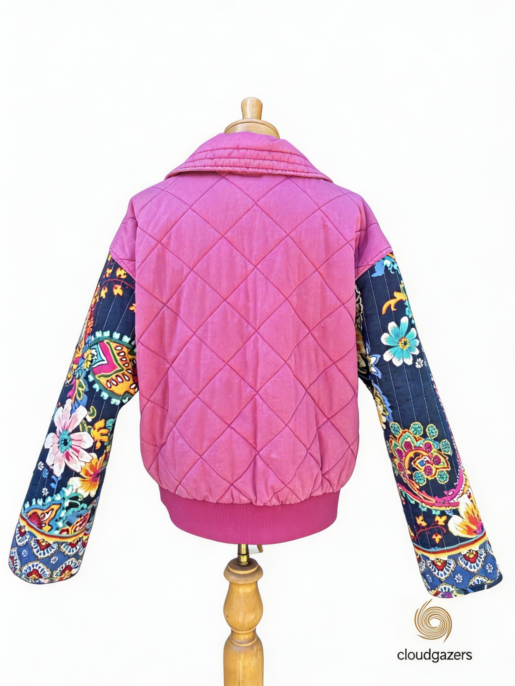 A pink quilted jacket with zip front and bold paisley print sleeves, handmade from upcycled pieces and fabrics.