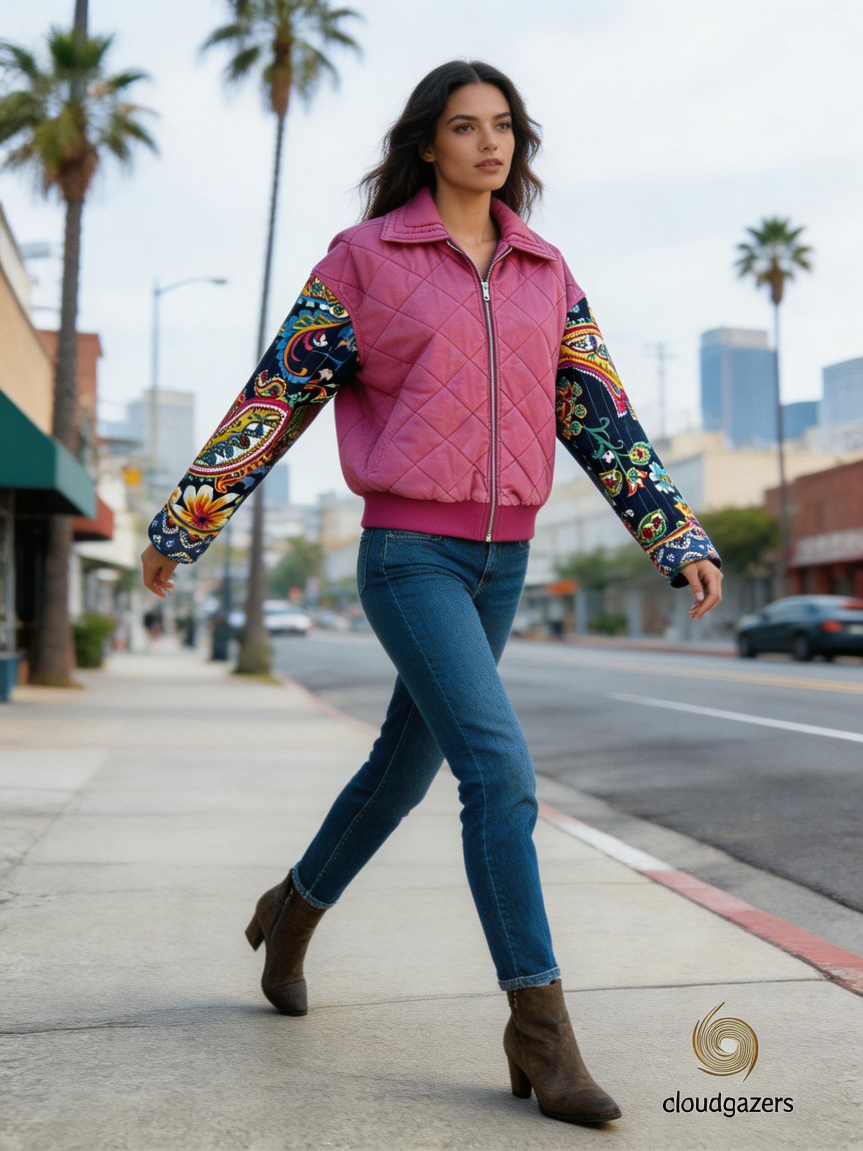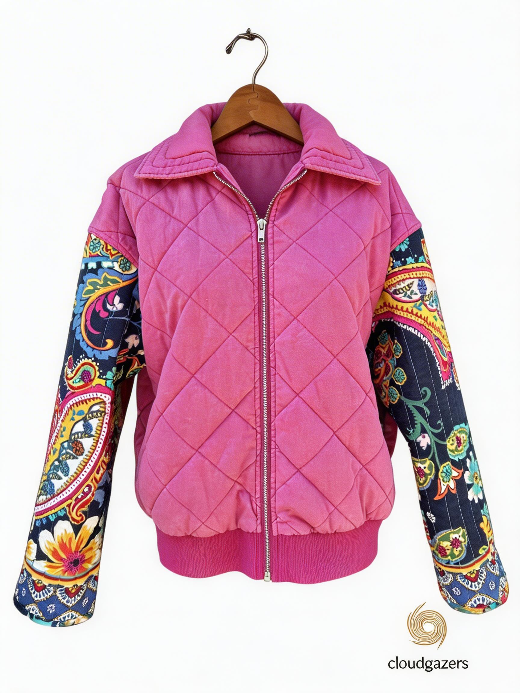 This jacket brings together a punchy mix of textures with a cozy quilted pink body and colorful paisley quilted sleeves. The front zips right up and there’s ribbed trim at the waist and cuffs, so it feels relaxed but not sloppy. Each sleeve uses a different section of patterned fabric, which keeps things interesting but still easy to style with jeans or a simple dress.
