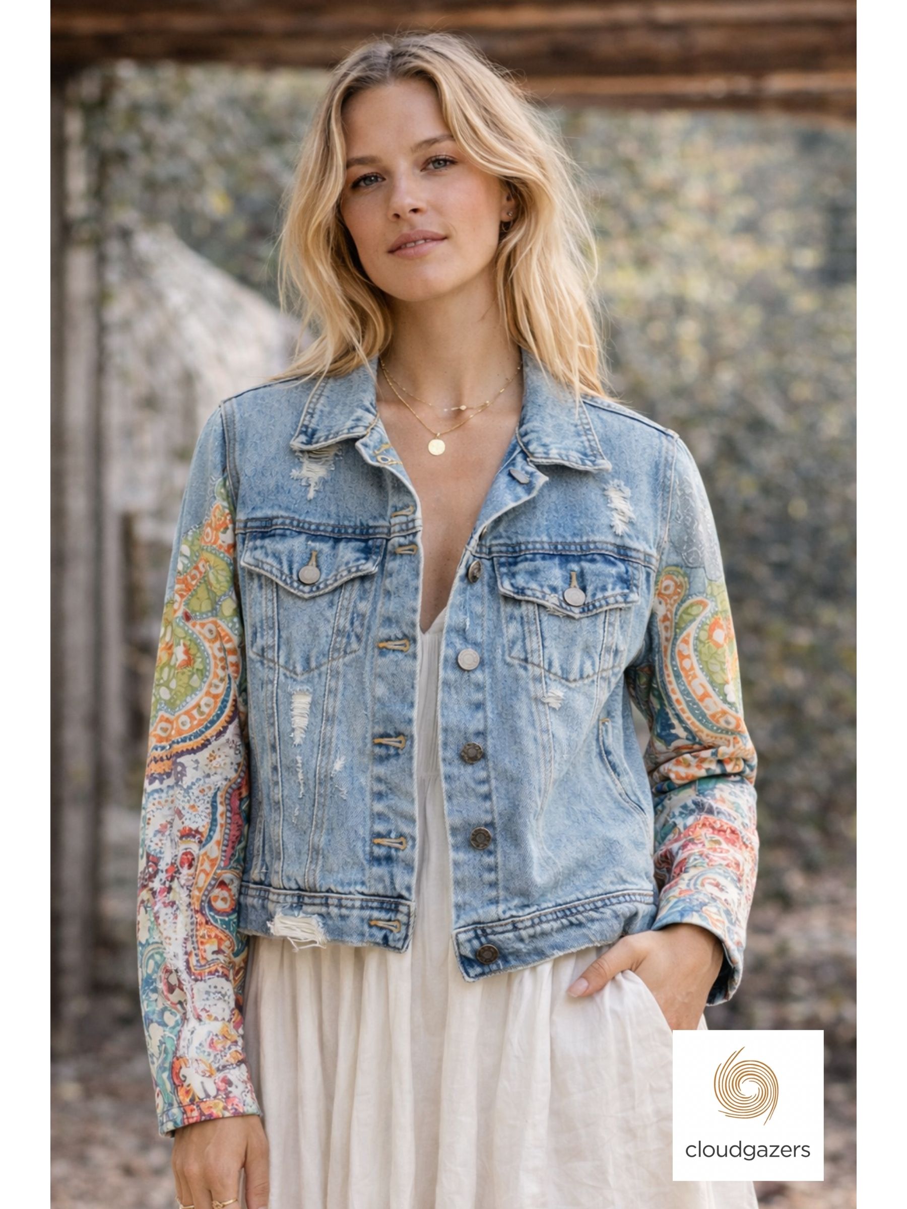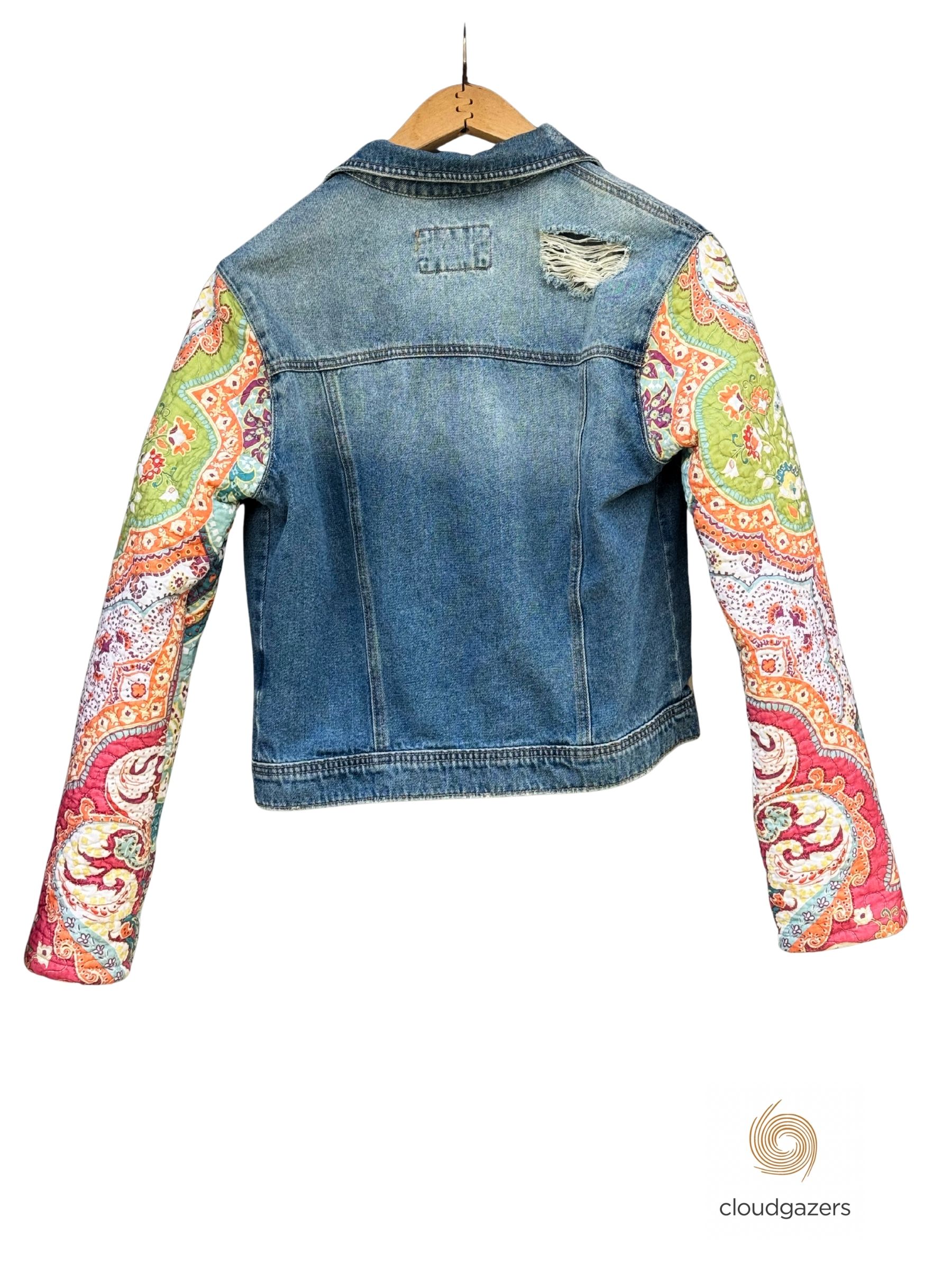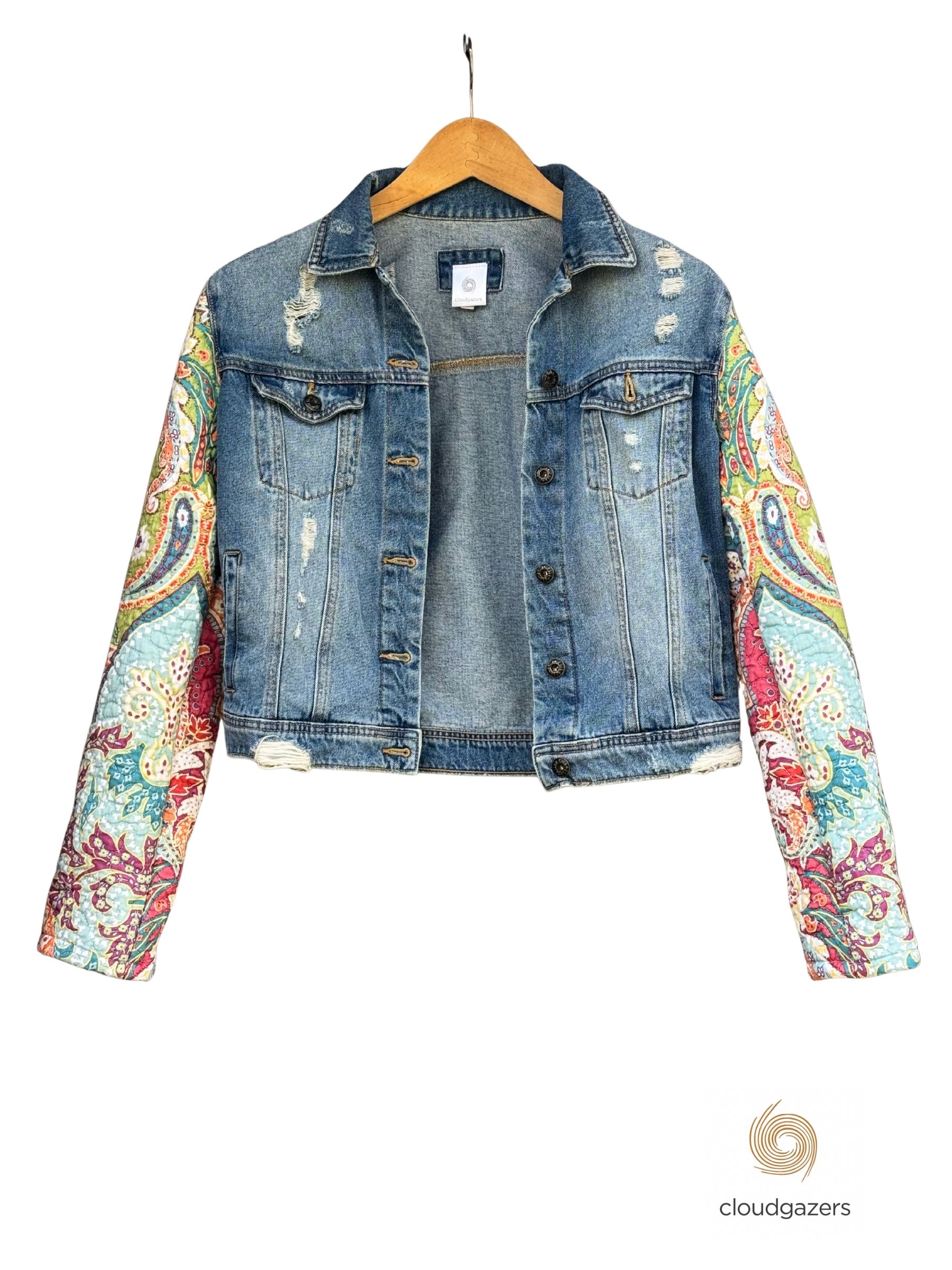 A one-of-a-kind denim jacket re-imagined from recycled materials, combining a light-wash denim body with vibrant quilted paisley sleeves. The classic silhouette is given new energy through contrasting textures, soft faded denim, and a playful mix of color.
