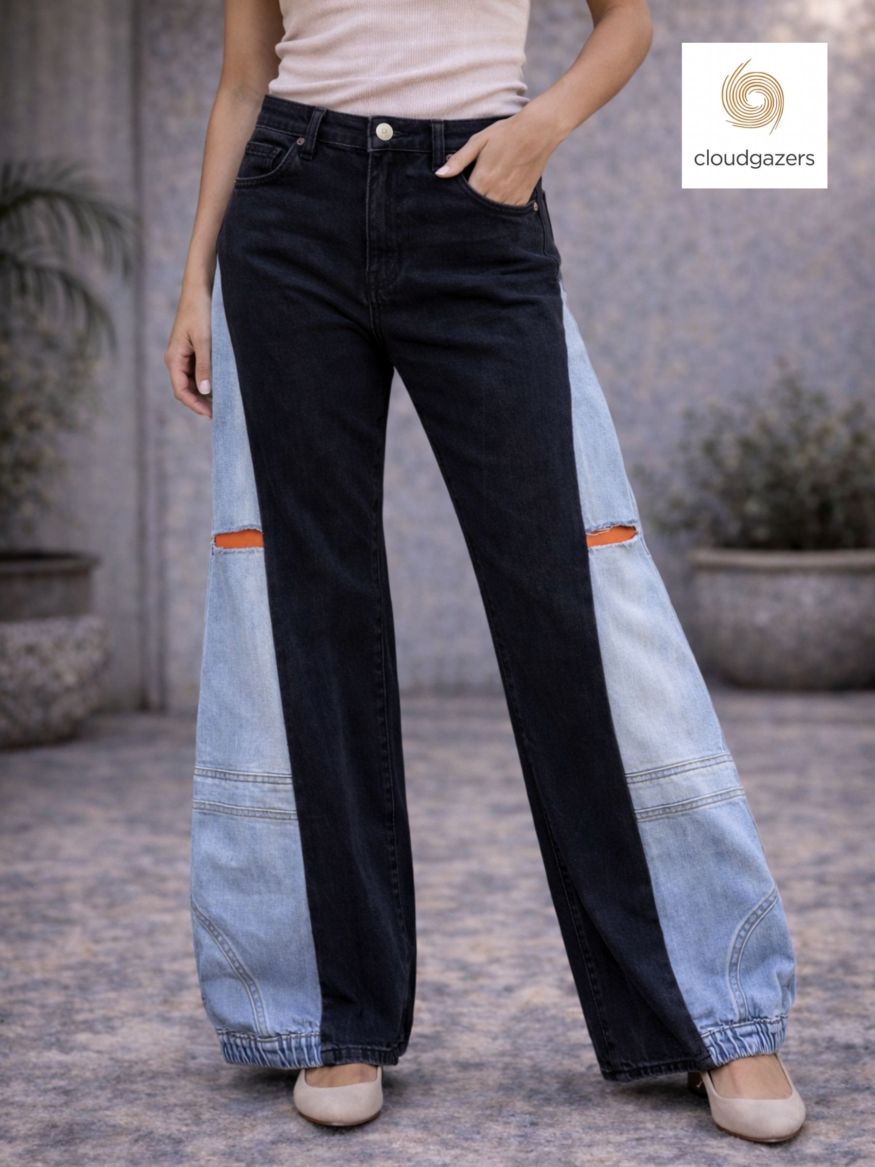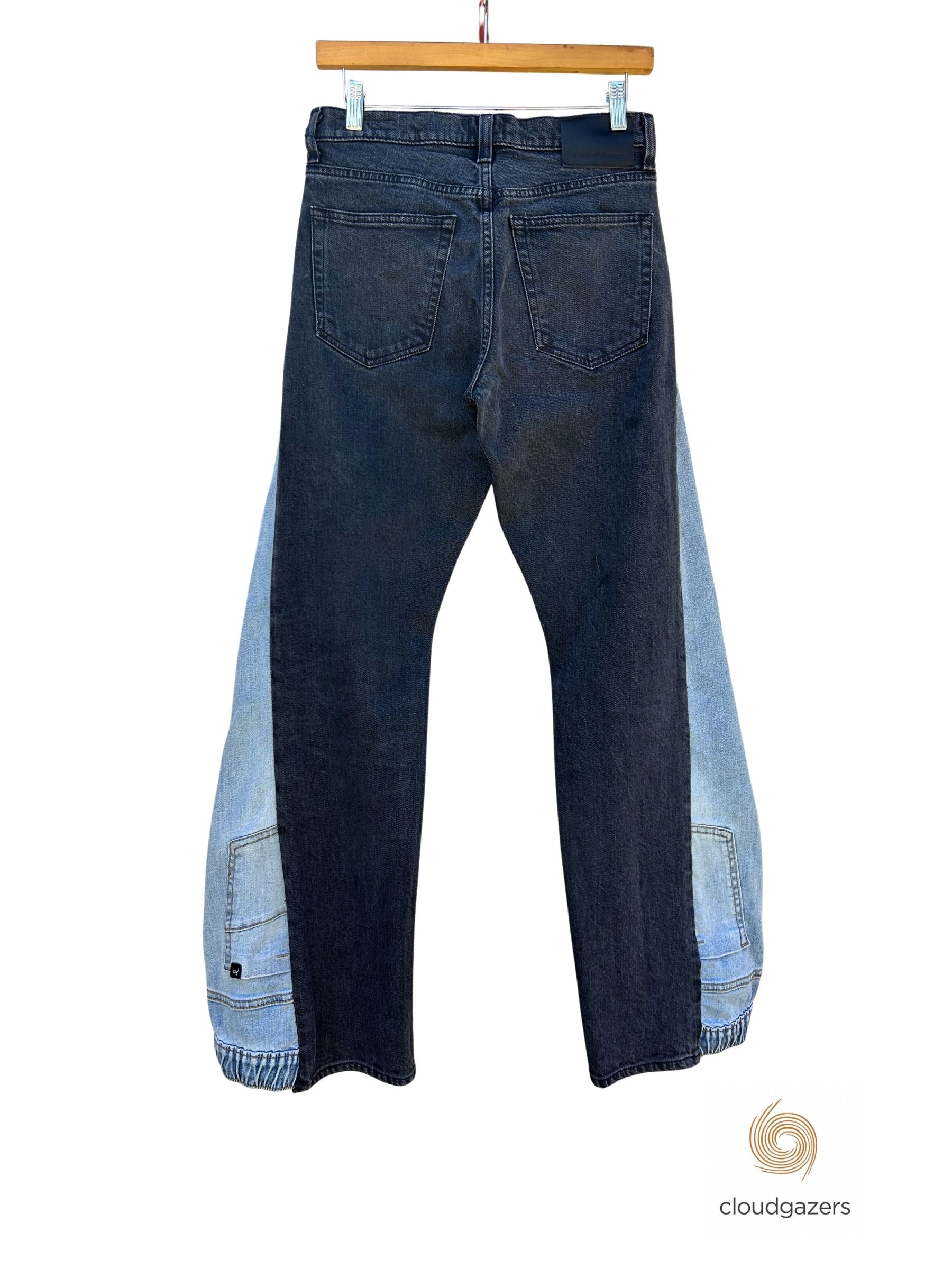 Handmade pants combining black and light denim with a wide leg and gathered hem.