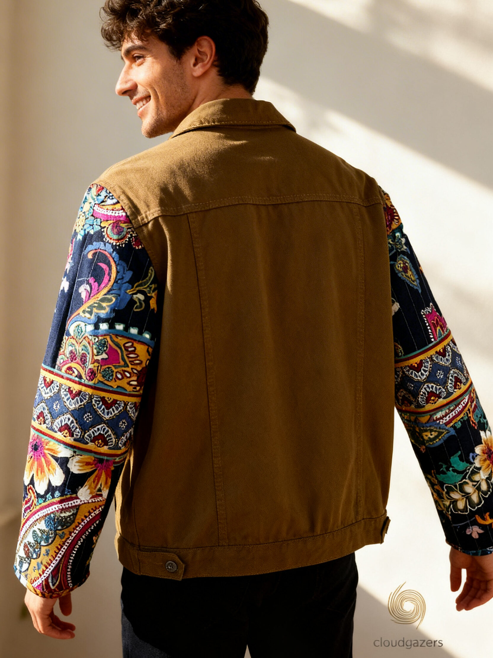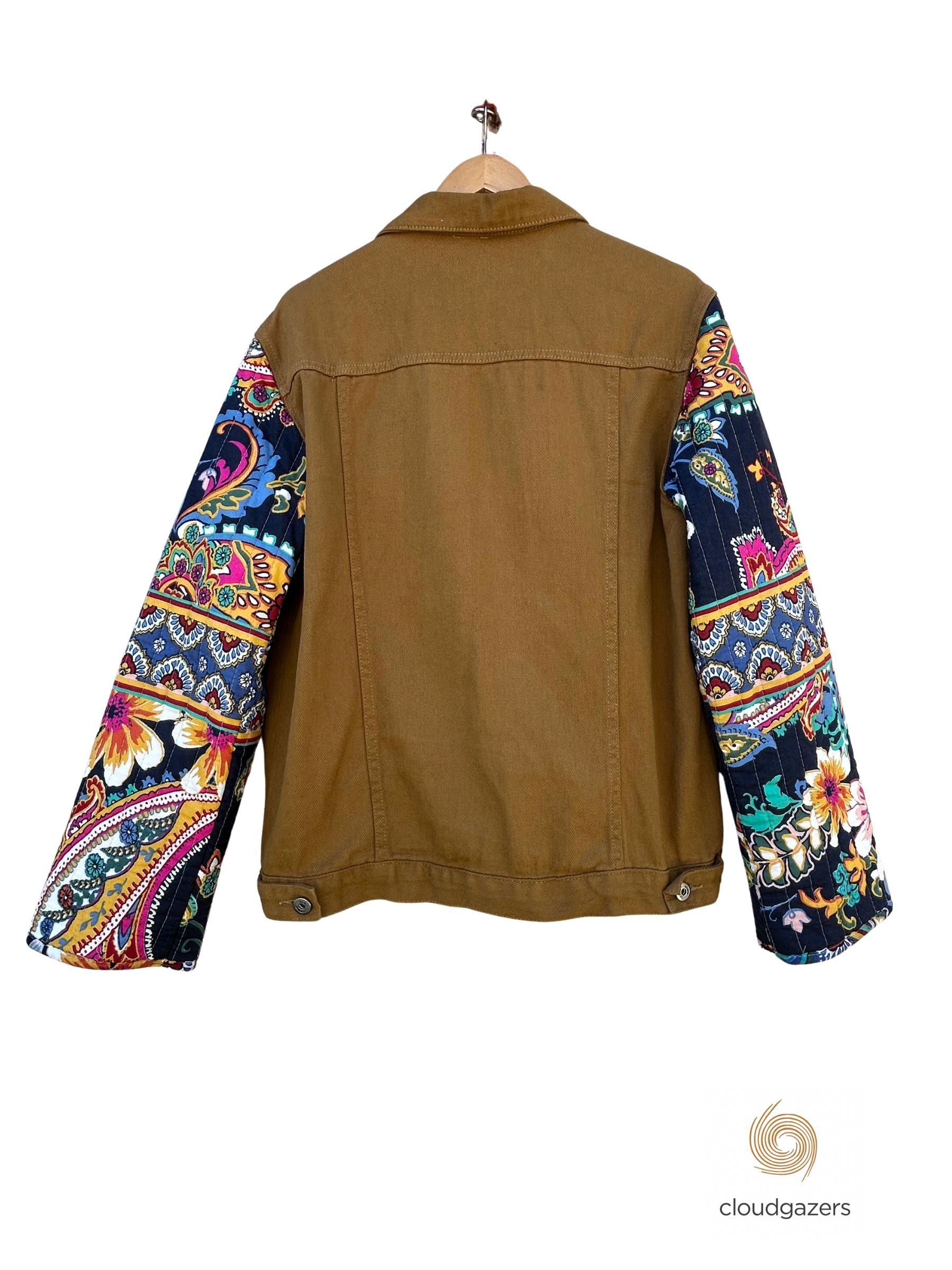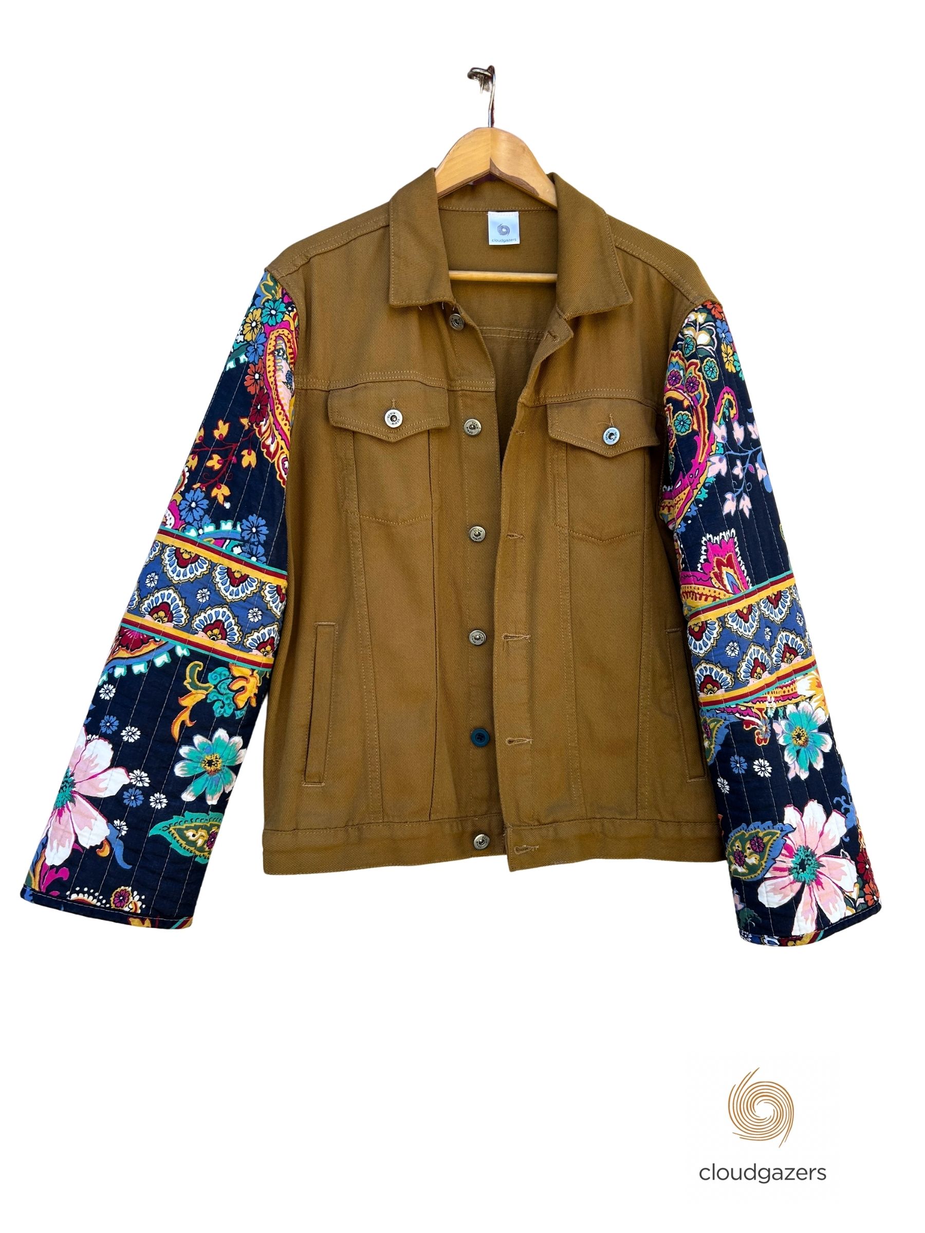 Handmade jacket with button front and colorful patchwork floral sleeves.