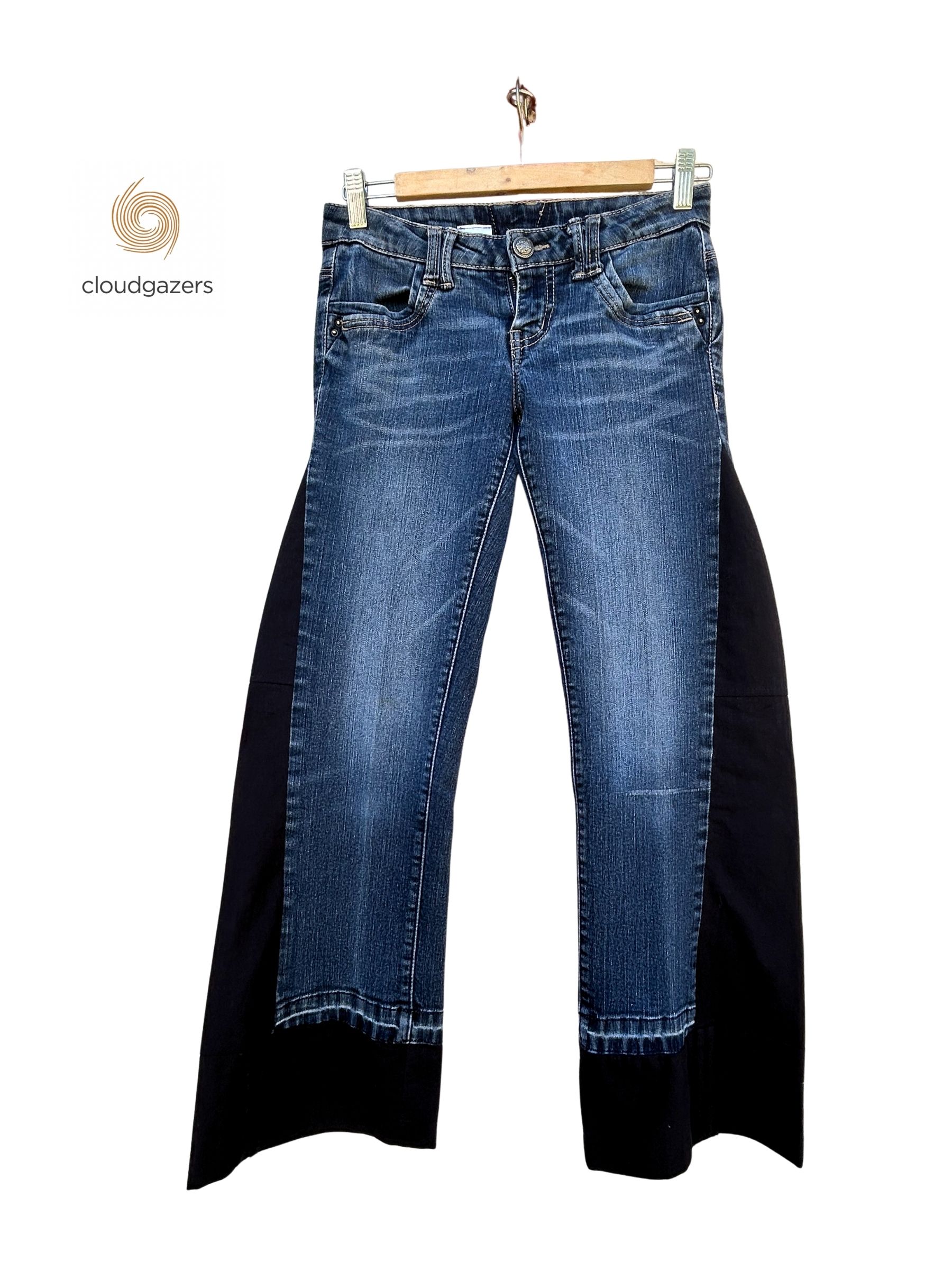 Reworked blue jeans with solid black side panels and wide-leg fit, each pair is handmade and one-of-a-kind.