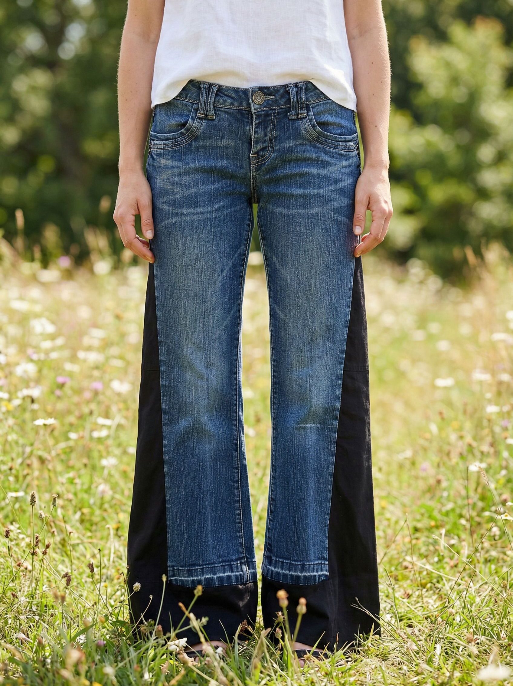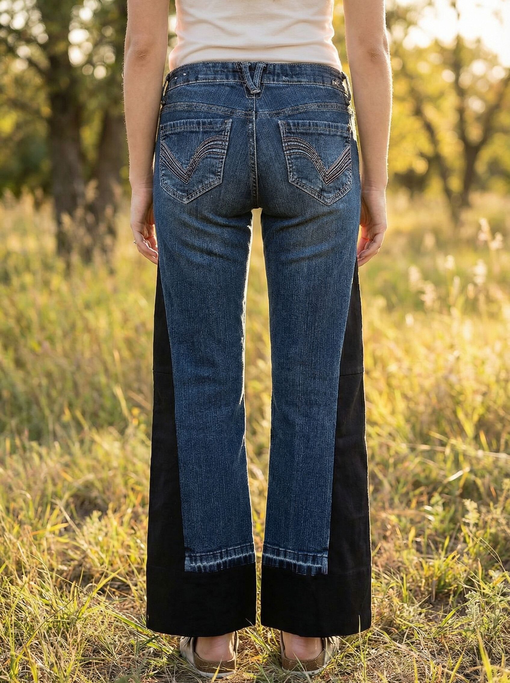 If you’re looking for jeans that are different from anything else in your closet, these might hit the spot. They’re originally blue mid-rise jeans, but black cotton panels have been sewn in along the sides to give them a wide-leg shape and extra comfort. The panels are solid black and slightly textured, so they stand out just enough against the denim. Because each pair is reworked by hand in Los Angeles, the original denim shows natural wear and each piece turns out a little different.