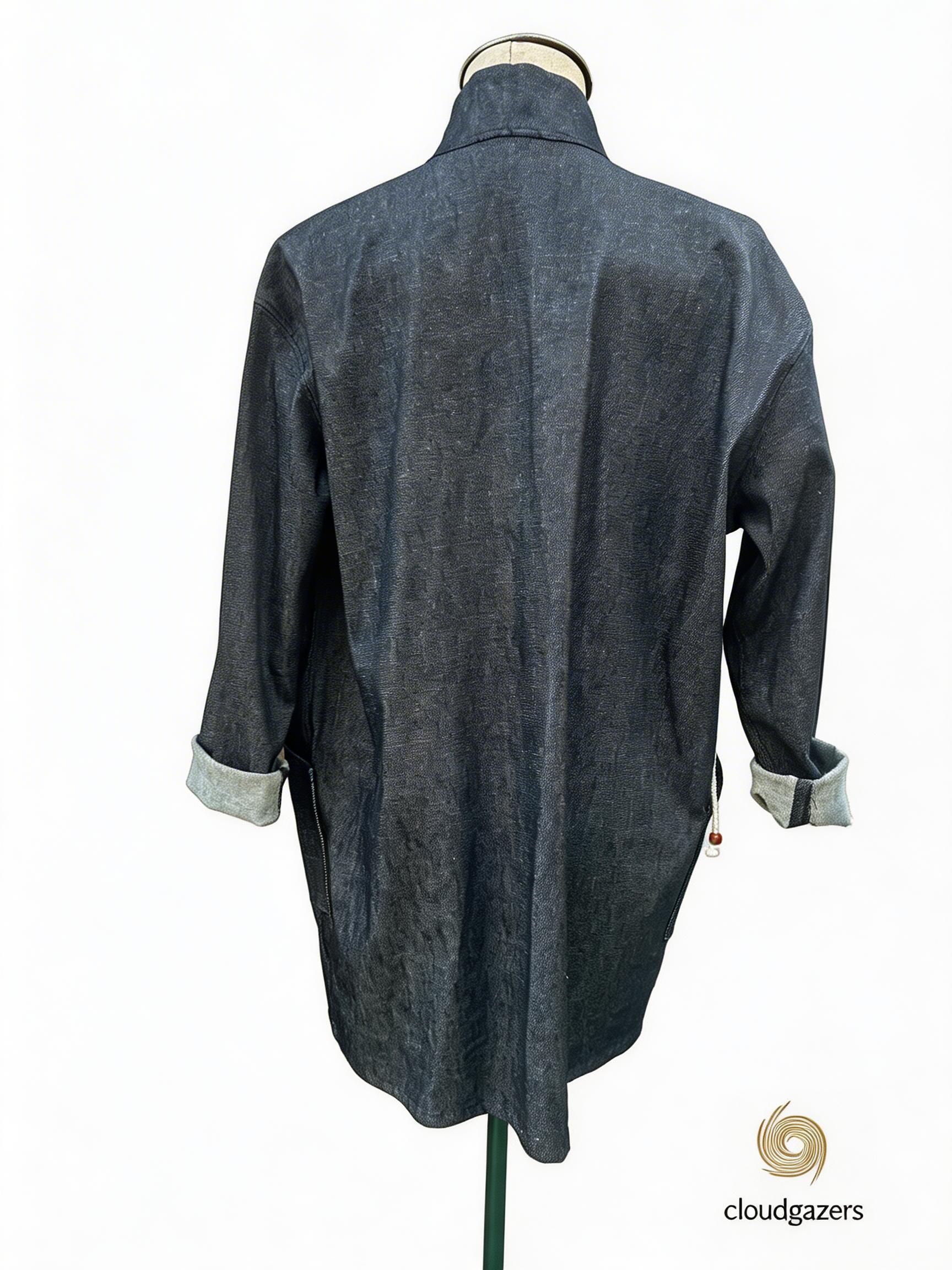 Easy-fitting unisex denim jacket with natural drawstrings and wood bead accents, handmade from rescued materials.